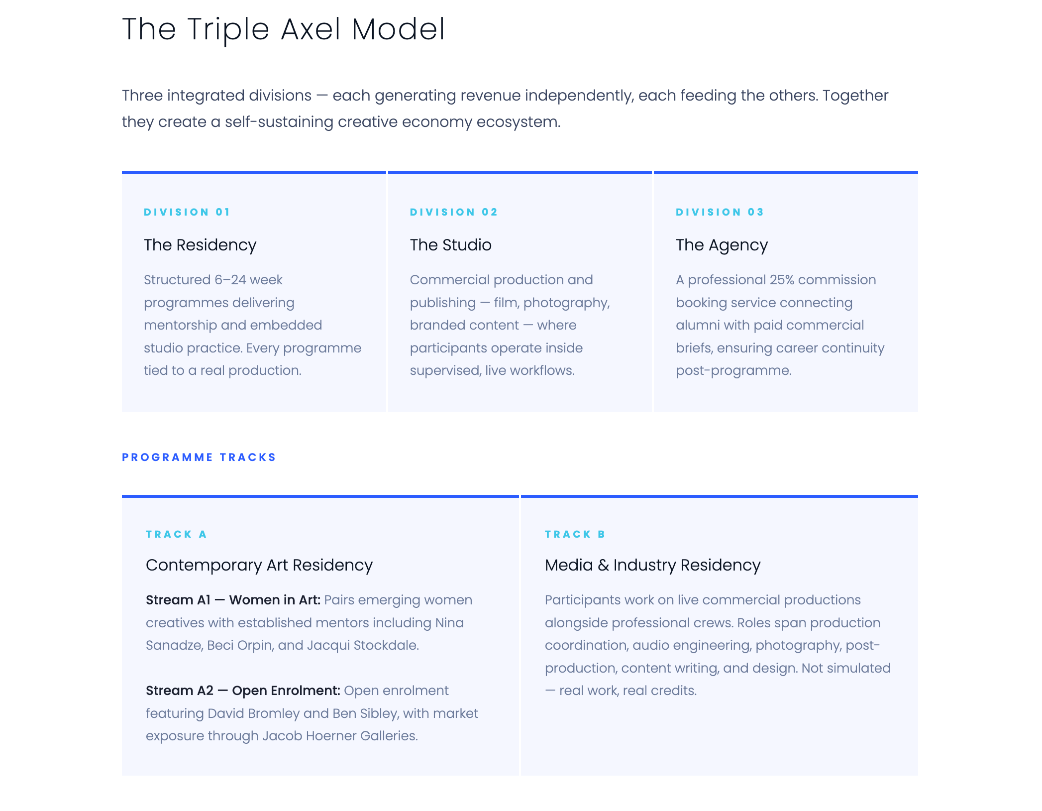 The Residency: Structured 6β24 week immersion programs delivering mentored training - embedded in studio practice.