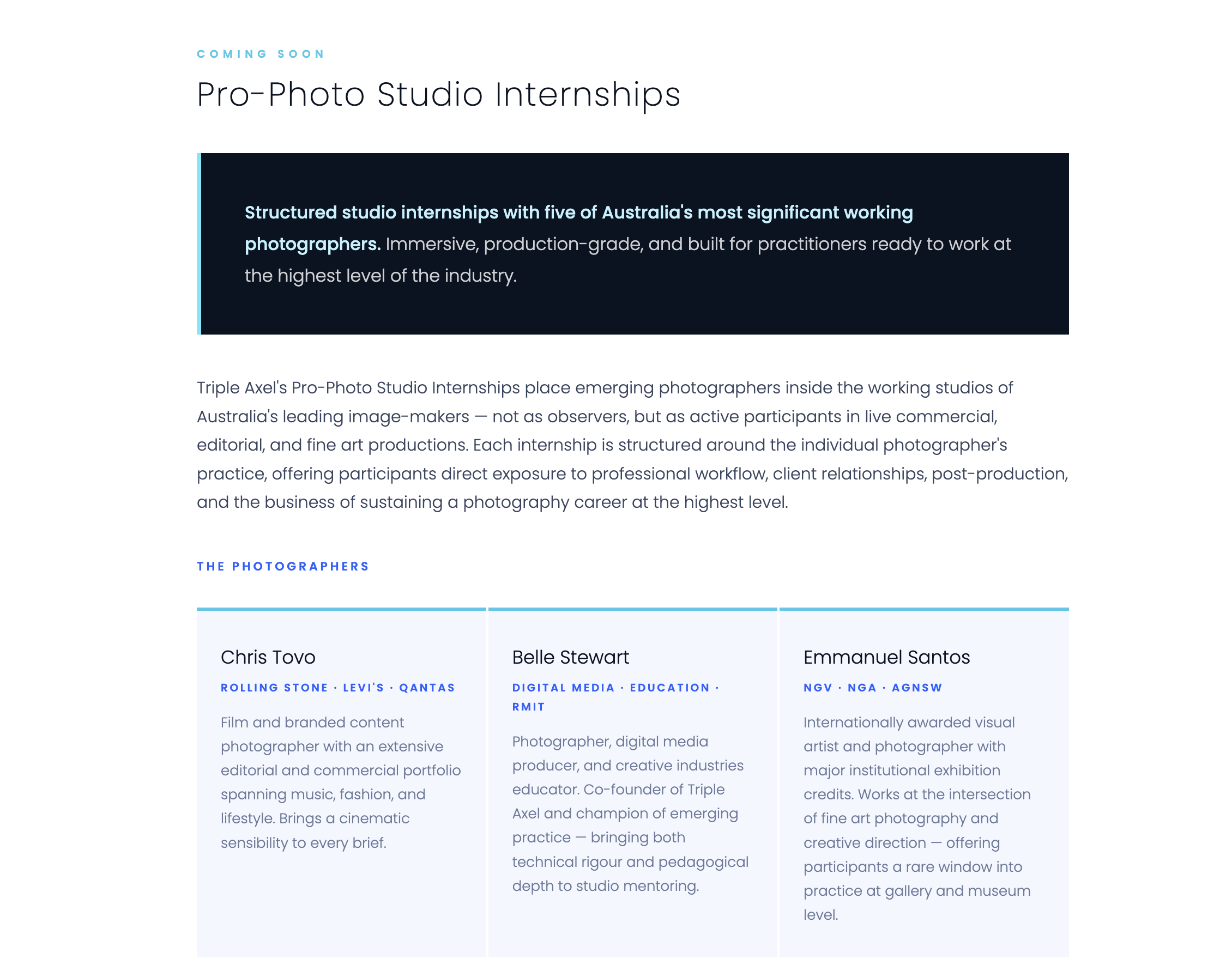 Triple Axel is expanding its global footprint by opening structured internship pathways for international practitioners. These programs offer a unique immersion into the Australian creative landscape, combining high-end commercial production with the cultural depth of our primary locations.