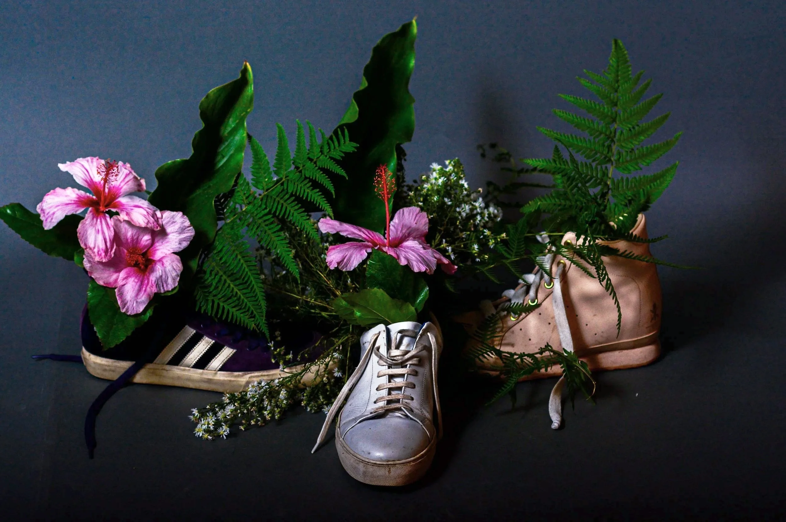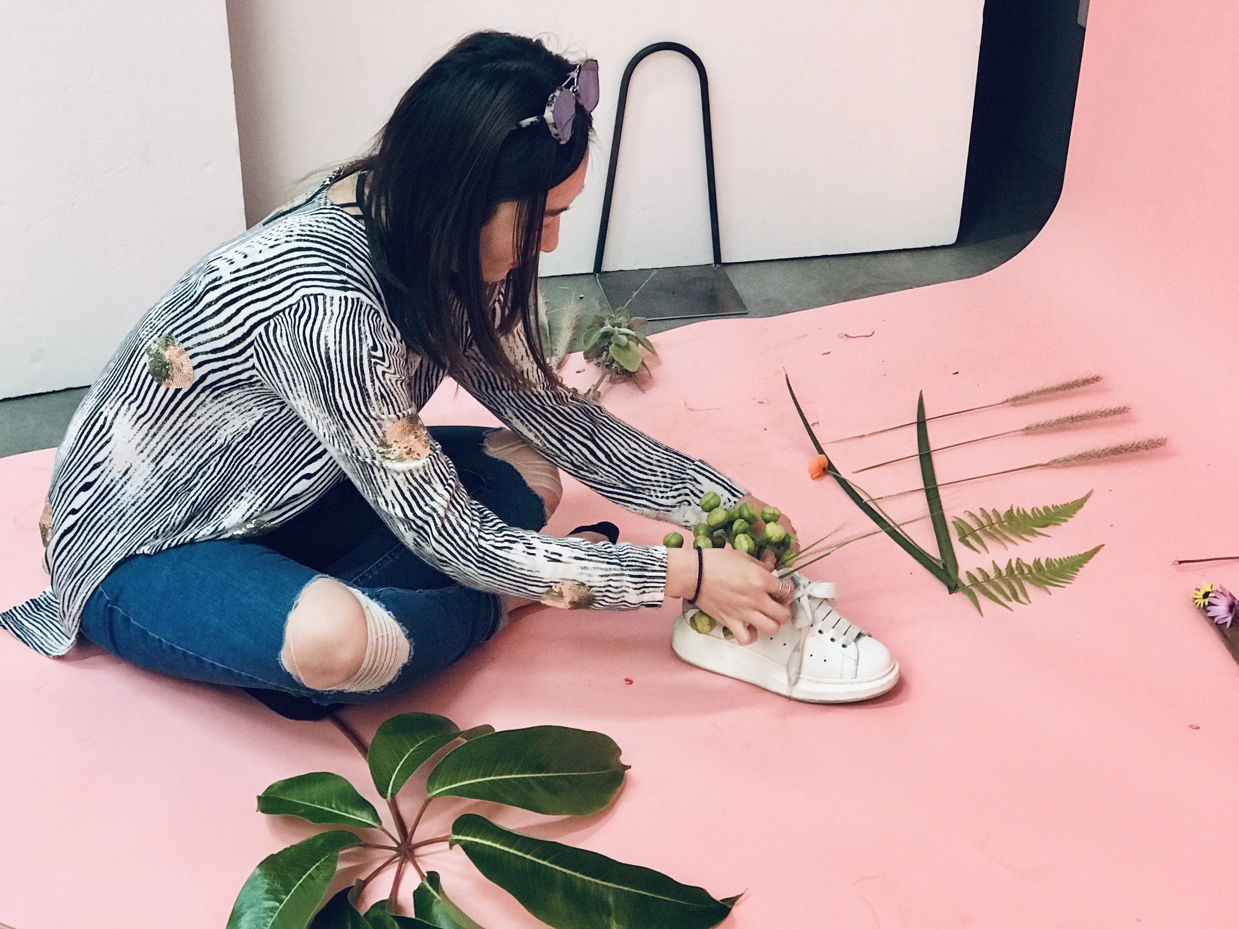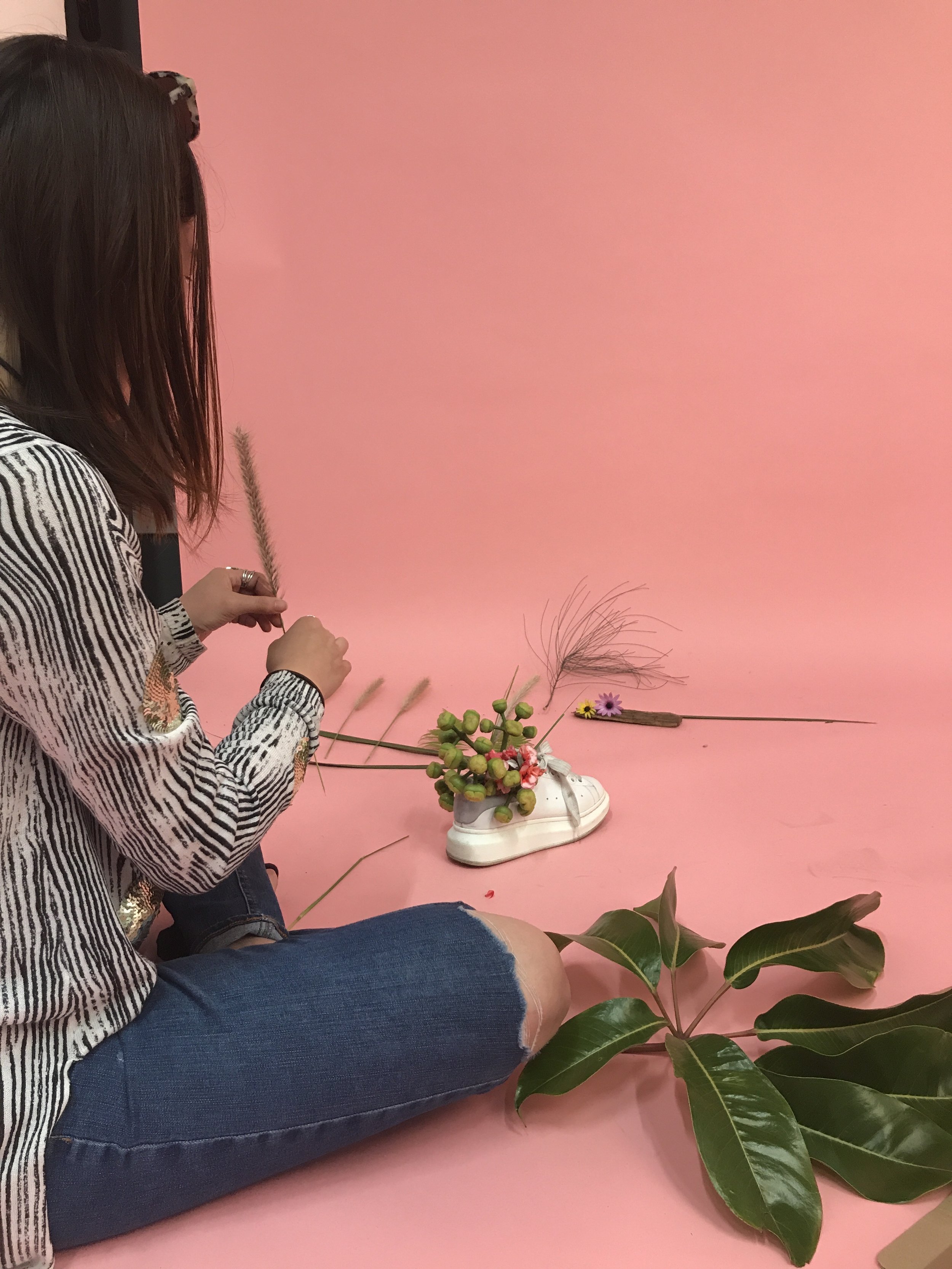 Students forage for flowers, then arrange flowers into βirrationalβ vessels - a shoe, a briefcase - with no water or soil.