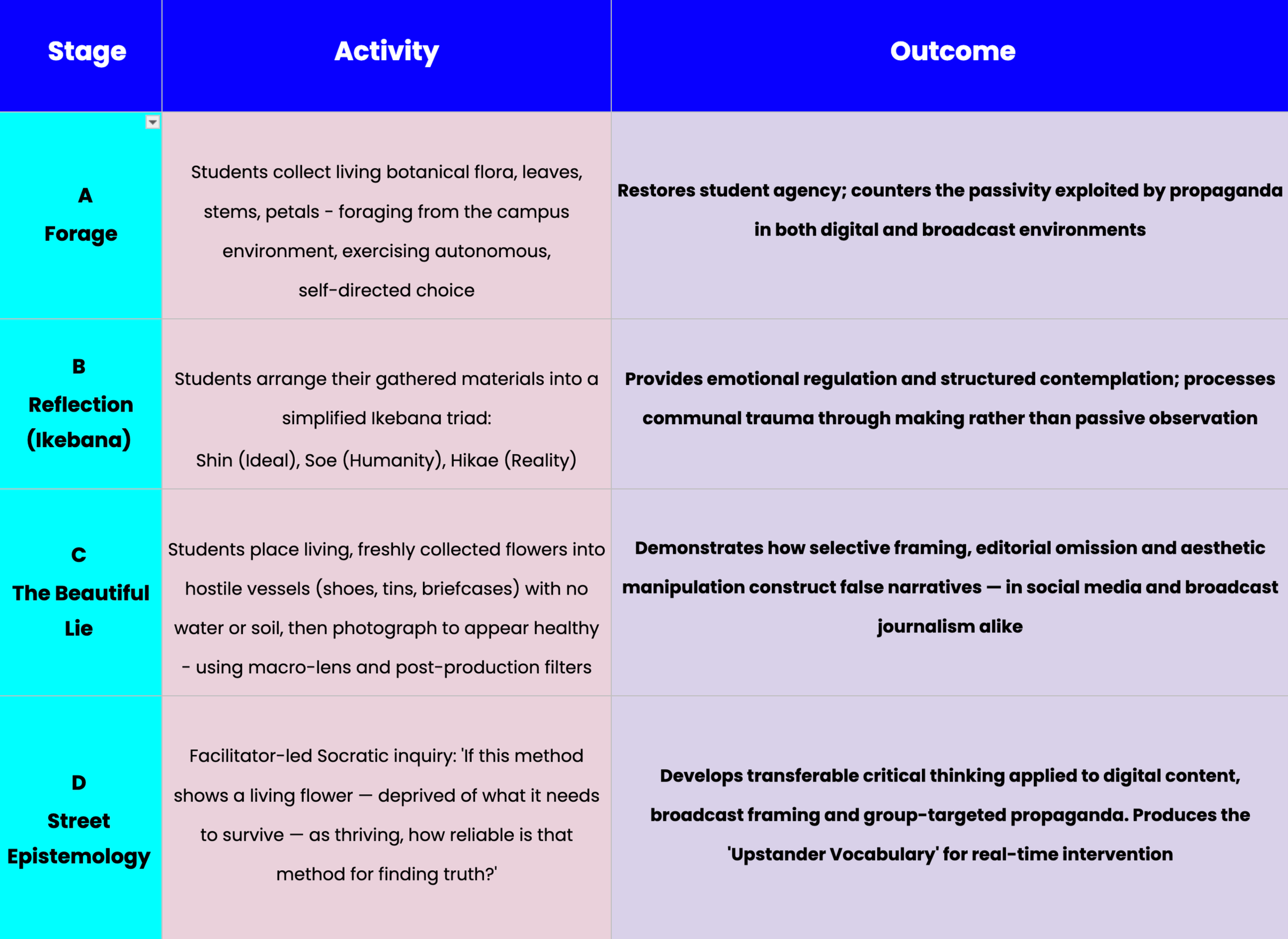 Reflection (The Truthful Arrangement): Before the 'Lie' begins, students engage in a simplified Ikebana practice to provide space for emotional regulation and the processing of communal trauma.