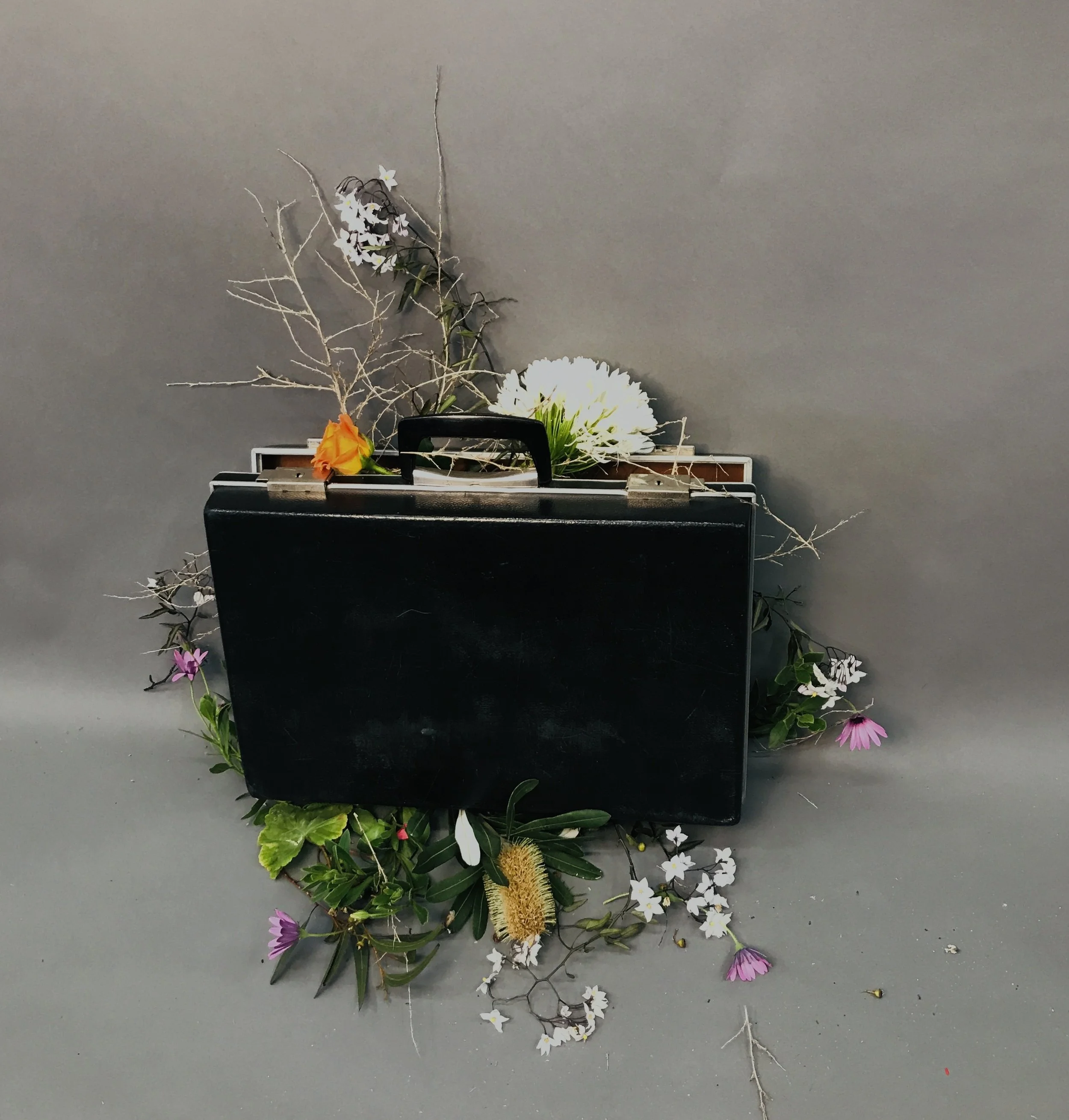 When students photograph their arrangements β flowers in a shoe, in a briefcase, in a tin, with no water and no soil β they are working in this grammar. The resulting image looks considered, even beautiful. It gives no indication that the flowers are already dying. The crop has done its work.